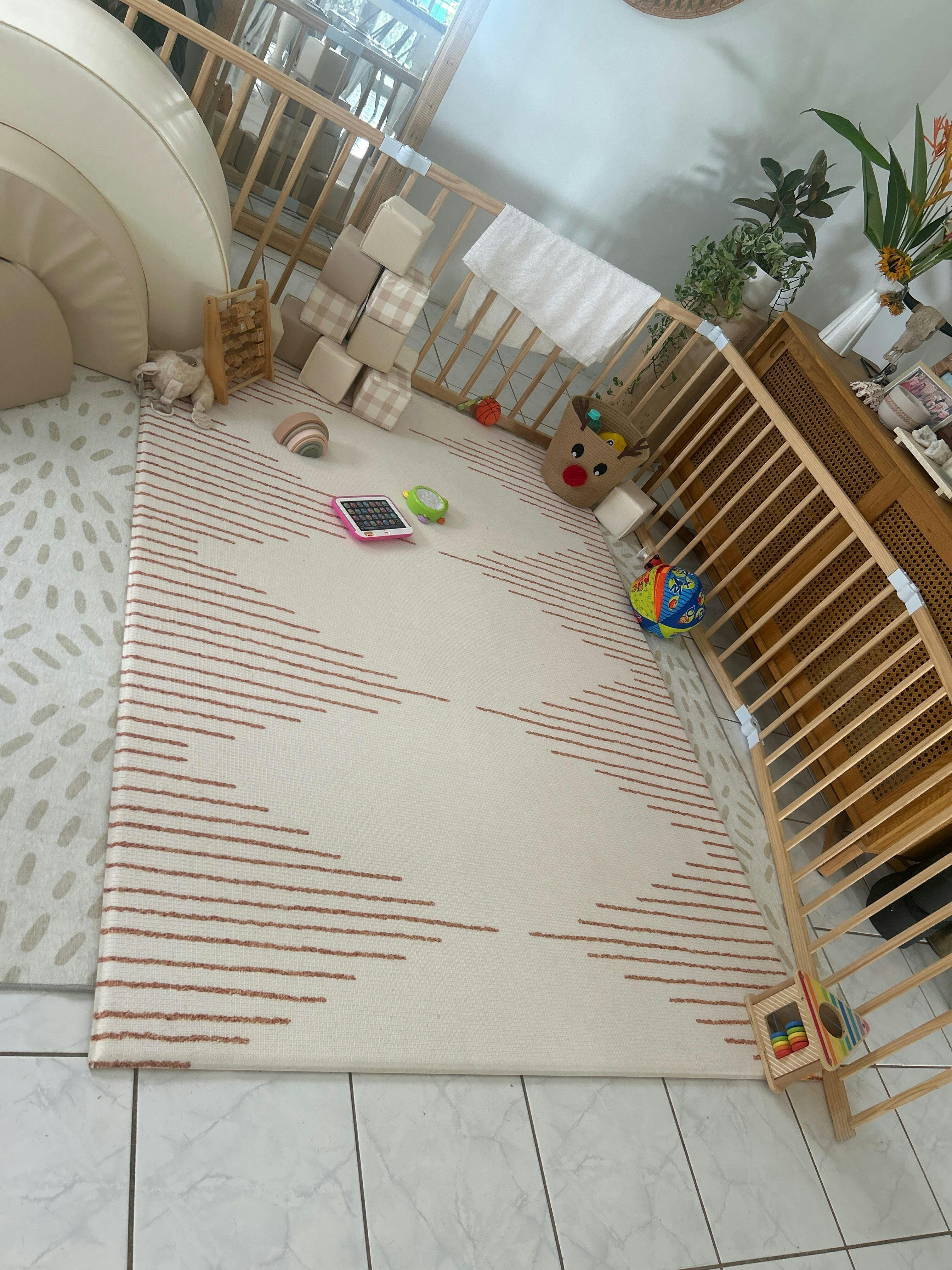 One side features our sleek Echo design for a modern touch, while the other boasts a Jute rug texture print for a natural, earthy feel. Designed to mimic high-end flooring, this mat seamlessly blends into any room while offering a safe, padded surface for play.